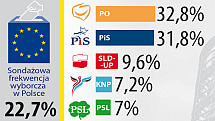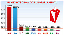 Według cząstkowych danych PKW zebranych z 91 proc. obwodowych komisji w wyborach do PE PiS uzyskało 32,35 proc. głosów, PO – 31,29